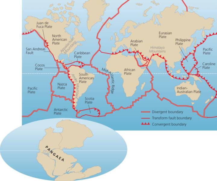 The supercontinent Pangaea formed 250 million years ago; its breakup has shaped the earth's continents and oceans.
