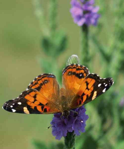 Complex symbiotic relationships form among prairie species, such as this American Painted Lady sipping nectar on Blue Vervain (Verbena hastata) and pollinating the flower in the process.