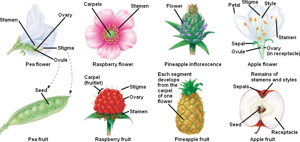 | A simple fruit develops from a single carpel (or several fused carpels) of one flower (lemon, peanut, banana). | An aggregate fruit develops from many separate carpels of one flower (raspberry, blackberry, strawberry). | A multiple fruit develops from carpels of many flowers (pineapple, mulberry, osage-orange). | An accessory fruit contains other floral parts (such as the receptacle) in addition to ovaries (apple, strawberry). |
