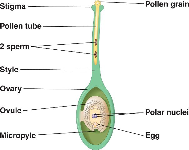 After landing on the stigma, a pollen grain produces a pollen tube that extends down through the style.