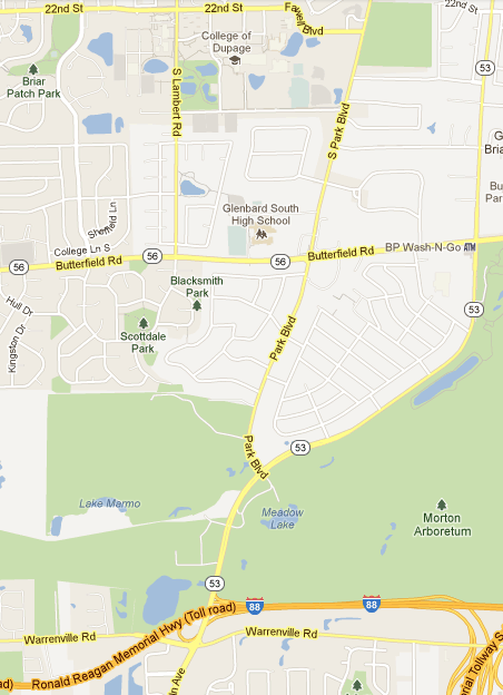 From campus, drive south on Park Blvd about 1 mile until Park Blvd dead-ends on Route 53.